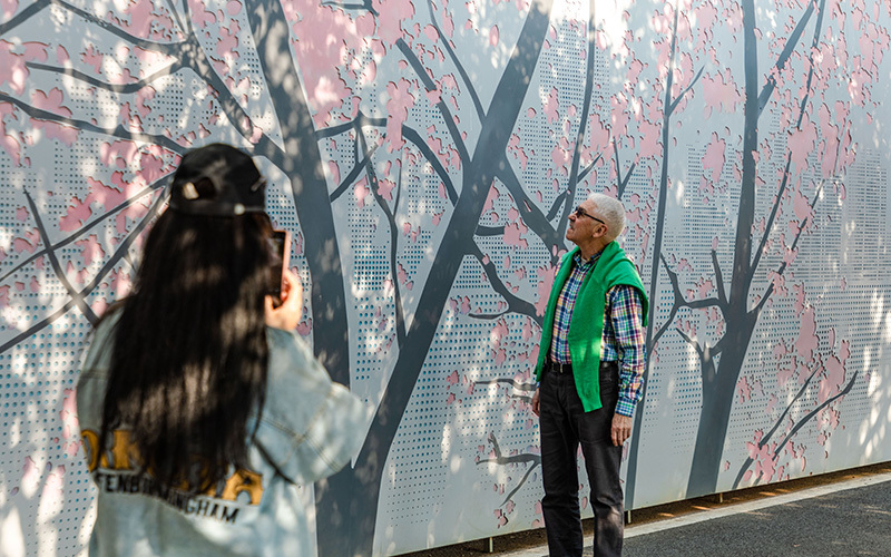 西北湖公园樱花墙吸引外国游客打卡。李军摄
